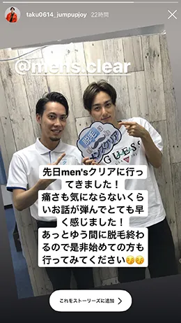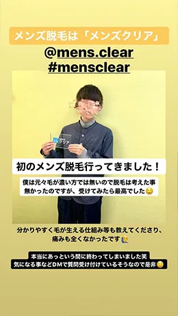 昔から、体毛が濃いのがコンプレックスでした。メンズクリアに通い始めてからは、周りの友人達からも「印象が全然違う!!」と驚かれています。清潔感がついたお陰か、自分に自信が持てるようになりました!!
