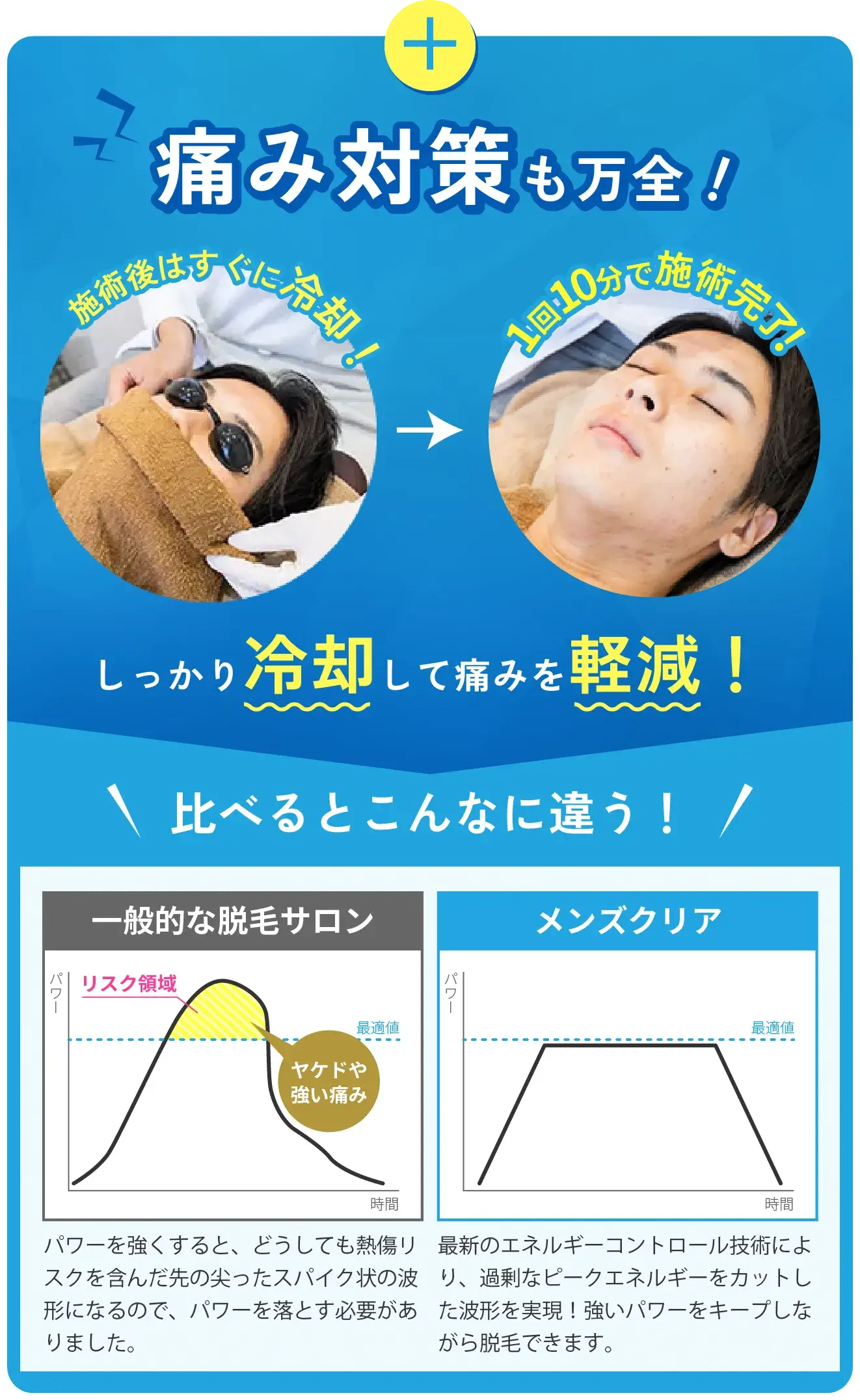 痛くないというと嘘になります。しかし、メンズクリアの脱毛機は、最新の機能と脱毛理論から作られている最新型の脱毛機のため、以前の脱毛機に比べ大幅に痛みが軽減できます。