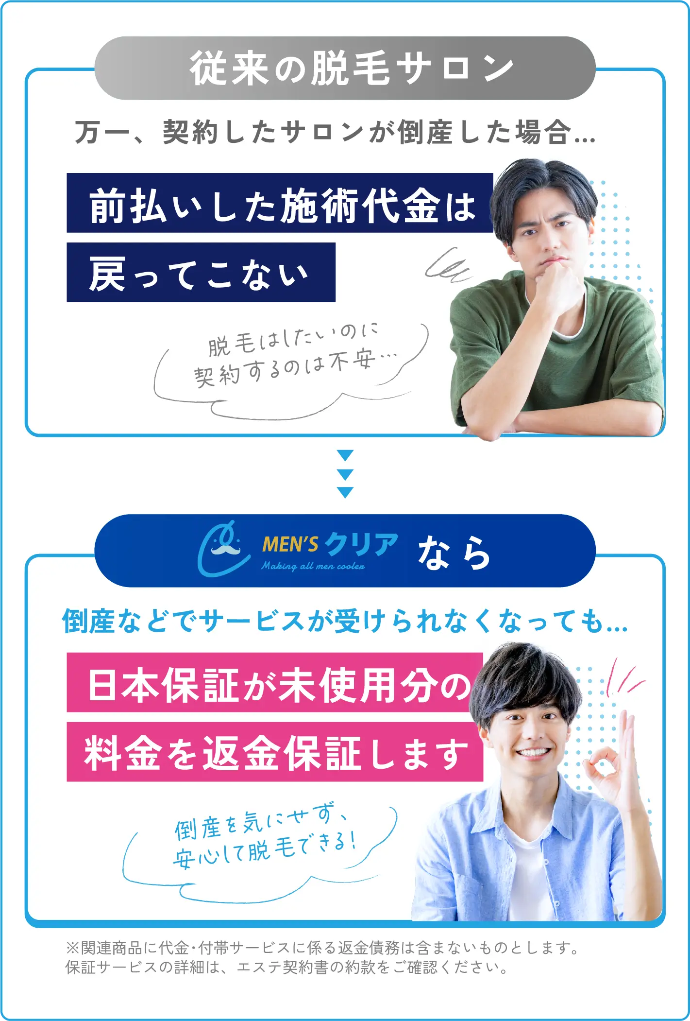 メンズクリアの脱毛は、表示価格以外にお金がかかることはございません。追加料金は一切なし。予算通りの脱毛ができます。