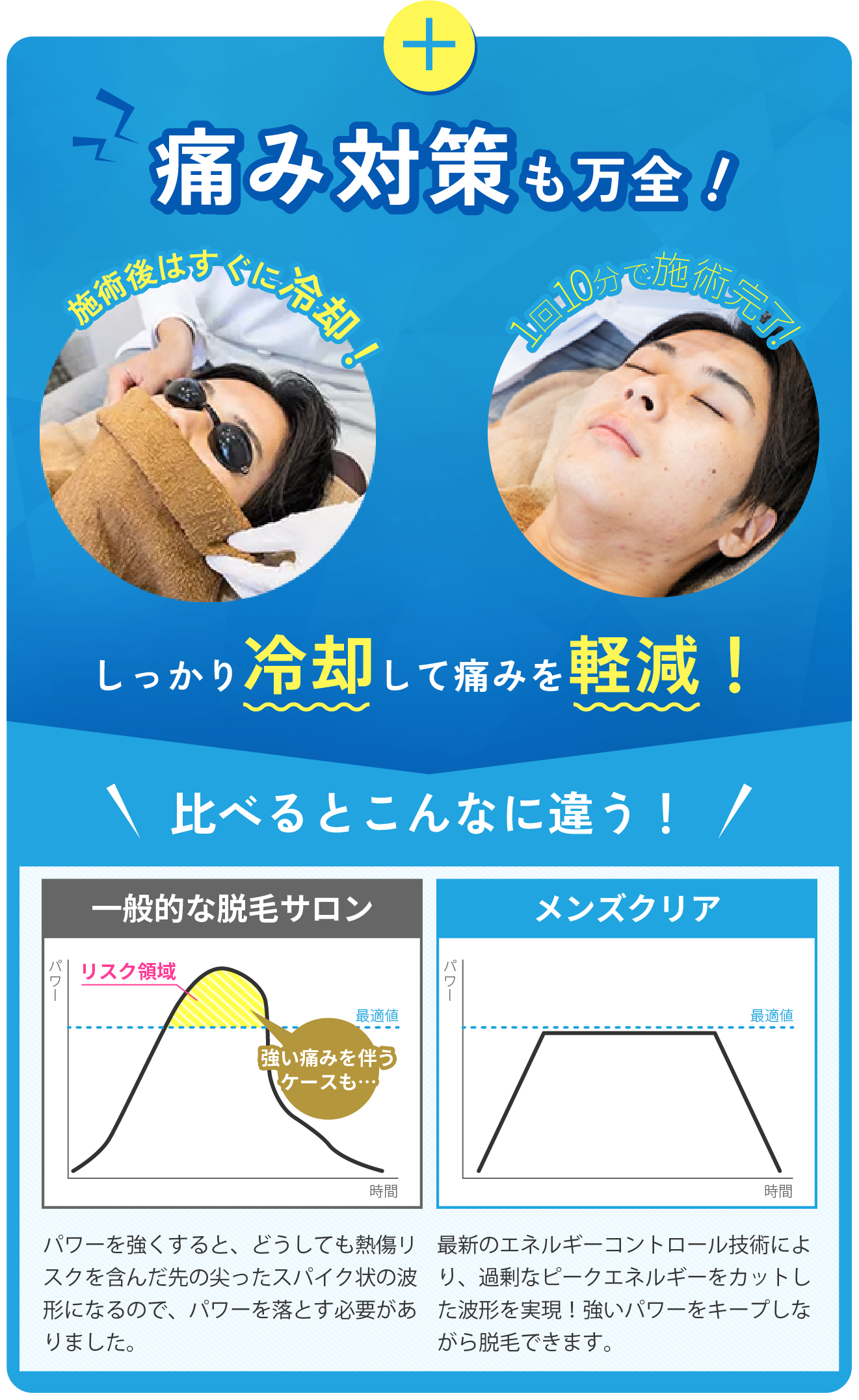 メンズクリアの脱毛は最先端のIPL×SHR脱毛を採用!先端をマイナス4℃に瞬間冷却することで、痛みを大幅に軽減できます!