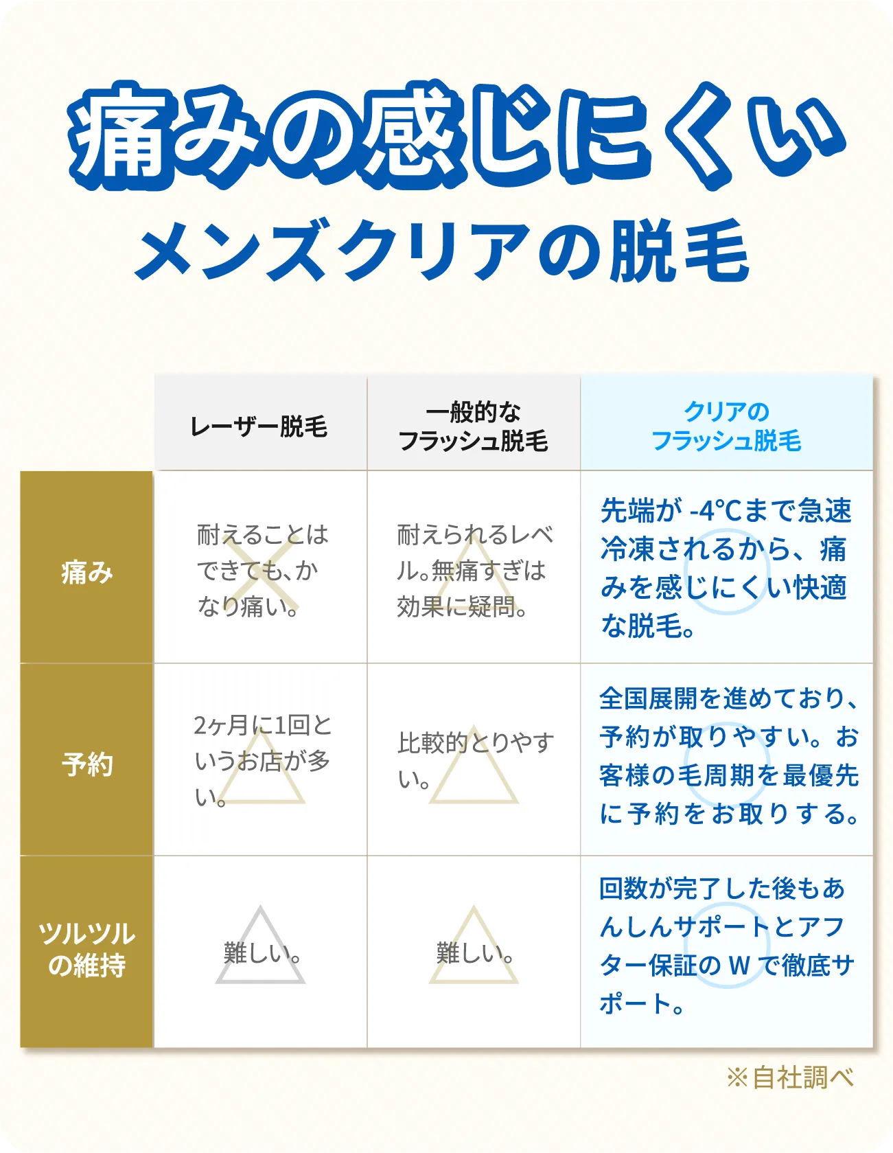 痛くないというと嘘になります。しかし、メンズクリアの脱毛機は、最新の機能と脱毛理論から作られている最新型の脱毛機のため、以前の脱毛機に比べ大幅に痛みが軽減できます。