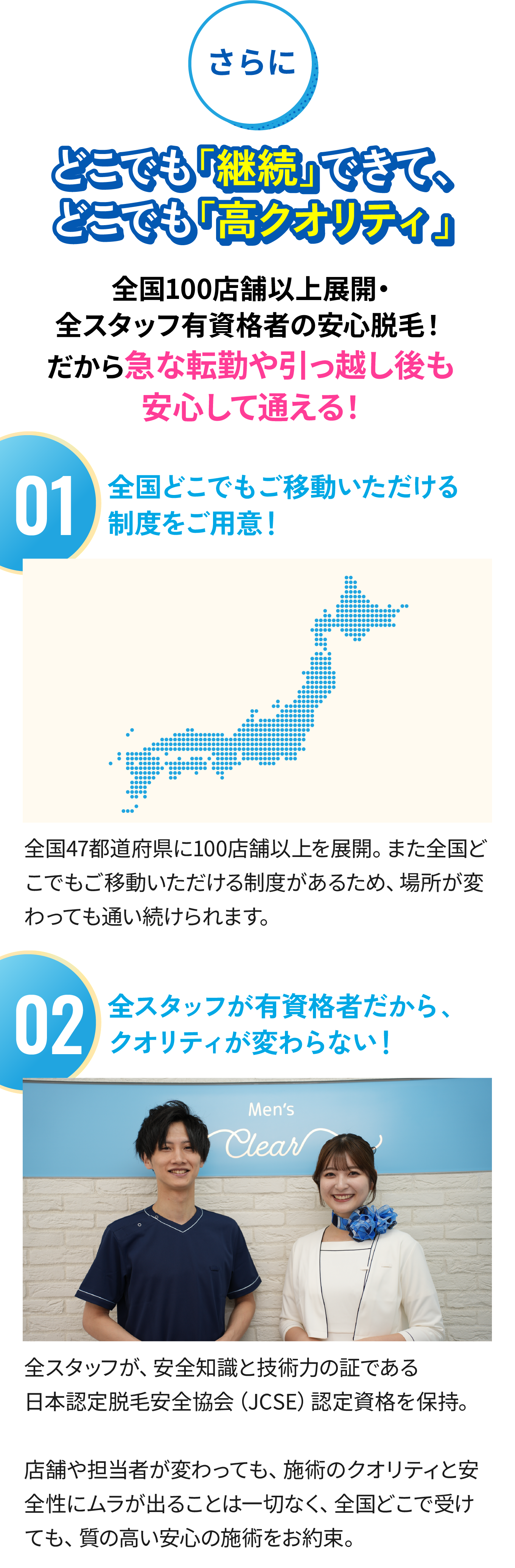 メンズクリアでは、強引な勧誘などは一切行っておりません。また、一見安く見えるコースに化粧品などを抱き合わせて販売するなどの行為も行っておりません。脱毛に興味がある方に気軽にご来店いただき、本当に継続して脱毛したいという方に通っていただけると嬉しいです。