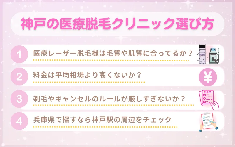 結論、神戸にある医療脱毛クリニックを選ぶポイントは以下の4つがあげられます。