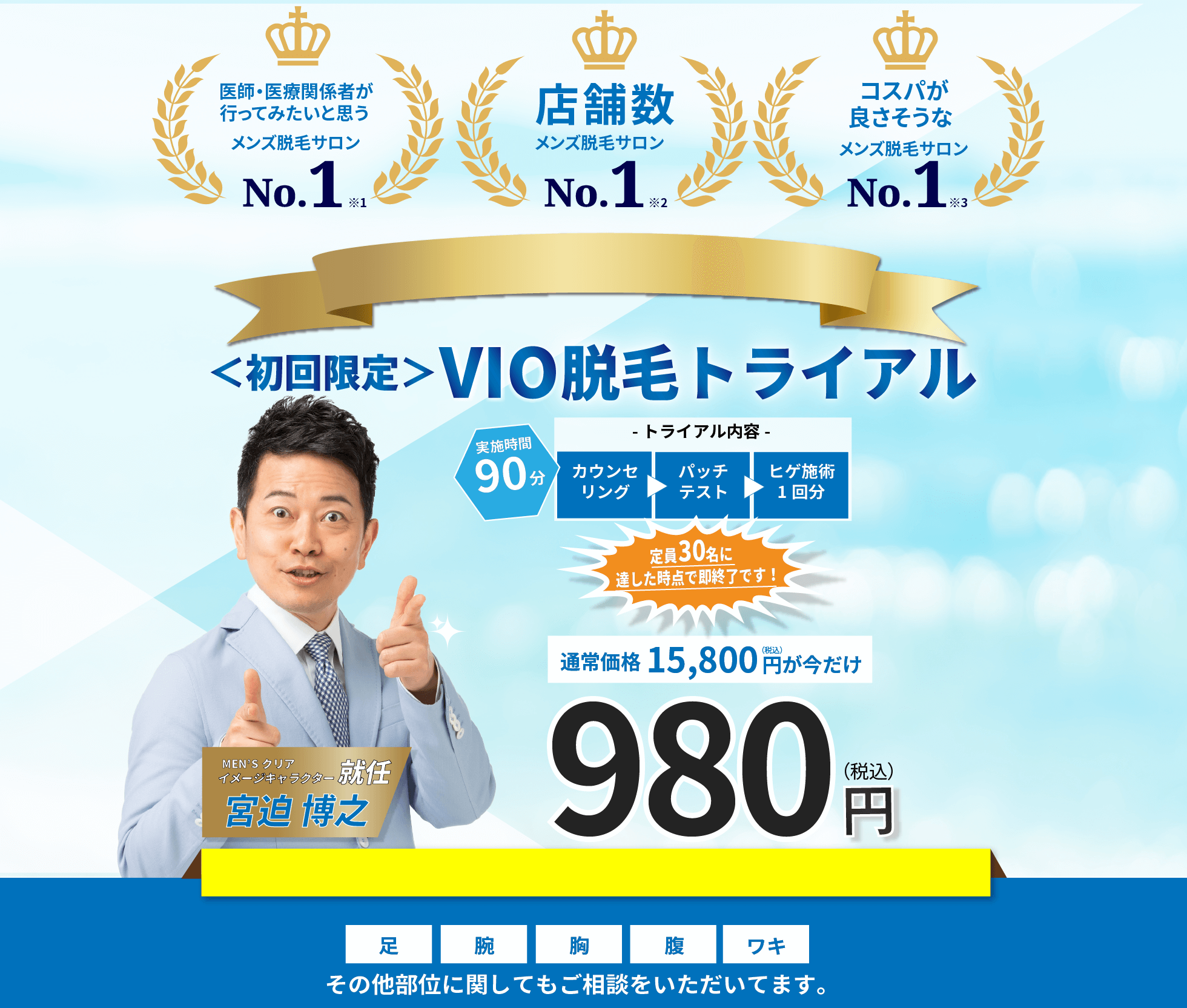 皆さまのおかげで、メンズ脱毛サロンに関してのアンケート5部門で第1位を獲得。(※6)多くの方々に選んでいただける信頼と実績があります。