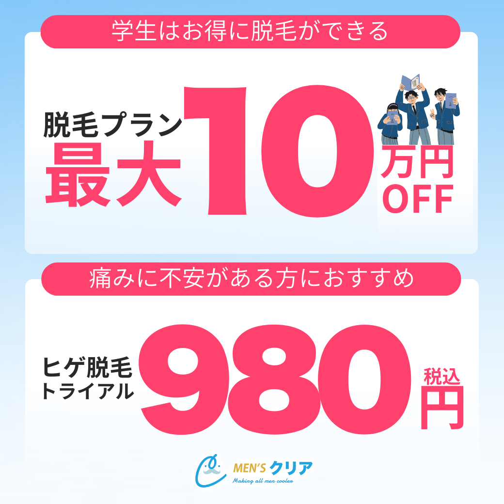 メンズクリアでは、学生証のご提示で最大10万円OFFとなる学割をご用意しており、月々無理なく通えるお支払いプランにも対応しています。