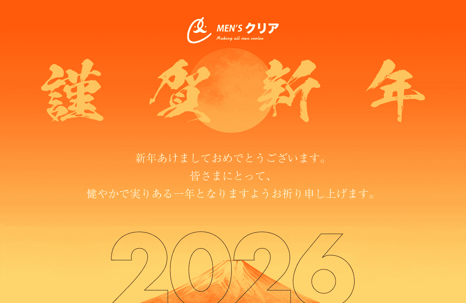 メンズクリアより謹賀新年のご挨拶 2026.01.01 新年あけましておめでとうございます。 旧年中は、メンズクリアをご愛顧賜り、誠にありがとうございました。 本年もスタッフ一同、お一人おひとりに寄り添った丁寧な対応を心がけ、 より安心して通っていただける脱毛サービスの提供に努めてまいります。 引き続き、変わらぬご愛顧を賜りますよう、何卒よろしくお願い申し上げます。 2026年1月1日 メンズクリア スタッフ一同